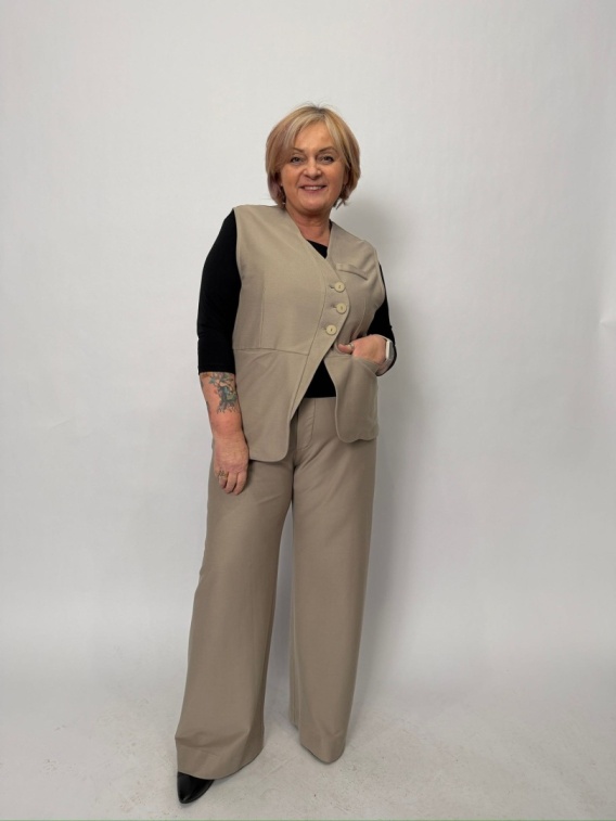 Garnitur AGRA to najnowsza propozycja od polskiej marki Rivabella. W tym wypadku na garnitur składa się kamizelka i spodnie. Spodnie z luźną nogawką, zapinane na zamek i guzik. Szeroka guma na plecach, kieszenie. Kamizelka o bardzo ciekawym kroju . Zapinana na guziki, asymetryczne linie z przodu. Kieszonki wpuszczane z przodu kamizelki