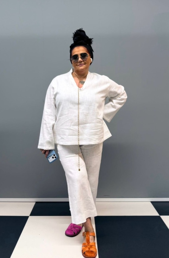 Komplet MIRELLA od polskiej marki Rivabella to elegancja propozycja na każdą okazję. Tunika i spodnie łączy kobiecość z nowoczesną formą. Spodnie na elastycznej gumie zapewniają komfort i swobodnę ruchów. Po bokach rozporki i stylowe lamówki . Tunika dekolt V.