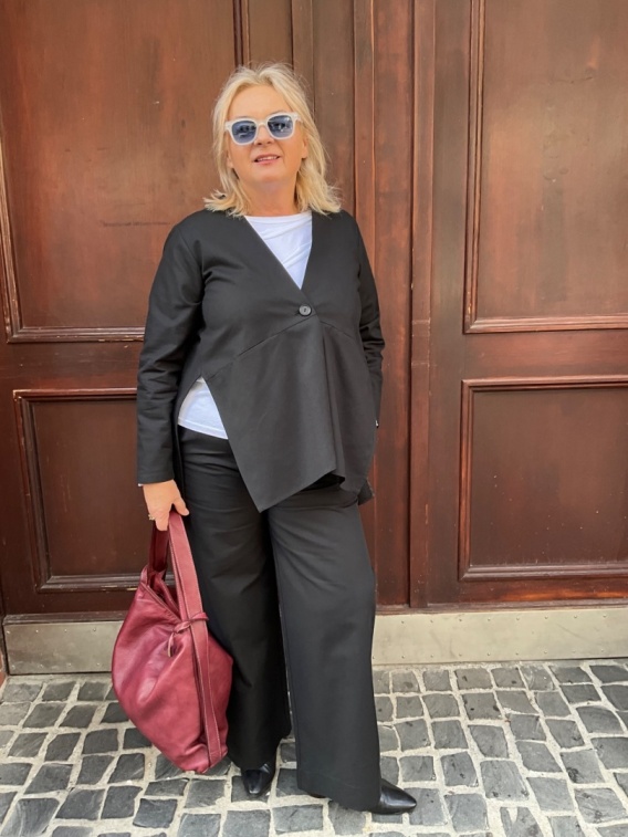 Komplet Mua to nasza jesienna propozycja w butiku od polskiej marki Rivabella. MUA składa się z marynarki oraz spodni. Marynarka jest zapinana z przodu na jeden guzik. Posiada zakładki oraz kieszenie, tył jest dłuższy.Spodnie są na gumie oraz mają kieszenie.Mua jest kompletem , który w składzie ma bawełnę- dzięki temu skóra będzie oddychać. Dodatkowo wystęuje w rozmiarach. Świetnie sprawdzi się z mokasynami.