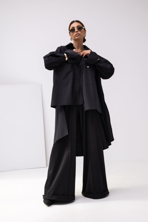 Nowoczesna koszula o wyjątkowym kroju – krótszy przód, wydłużony i rozszerzany tył, szerokie rękawy i subtelne logo marki z tyłu na kołnierzyku. Idealna na eleganckie wyjścia i do stylizacji z szerokimi spodniami. Stylowa, wygodna i ponadczasowa – must-have w każdej kobiecej garderobie.