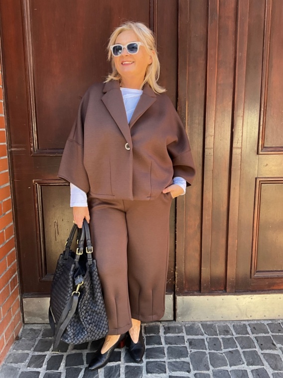 Spodnie HAVI w kolorze cynamonowym to połączenie elegancji i wygody w nowoczesnym wydaniu. Model posiada gumkę w talii, która zapewnia komfort noszenia i idealne dopasowanie do sylwetki. Klasyczne kieszenie nadają im praktycznego charakteru, a nogawki z zaszewkami w długości 7/8 subtelnie podkreślają linię nóg i wprowadzają lekkość do stylizacji. Cynamonowy odcień pięknie komponuje się z neutralnymi barwami, tworząc ciepły, jesienny akcent w garderobie. Spodnie wykonane są z przyjemnej w dotyku tkaniny, dzięki czemu doskonale sprawdzą się zarówno w eleganckich, jak i codziennych zestawieniach. Model tworzy stylowy komplet z żakietem KELIS, tworząc spójną i szykowną całość – idealną do pracy, spotkań lub miejskich stylizacji.