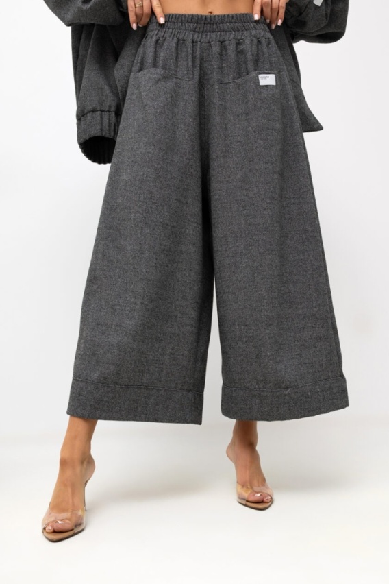 Stylowe i wygodne kuloty o luźnym kroju, wykonane z lekkiego materiału, który swobodnie układa się na sylwetce. Nogawki szerokie, sięgające do połowy łydki, zakończone podwinięciem, które dodaje im casualowego, nonszalanckiego charakteru. Z przodu znajdują się dwie duże, naszywane kieszenie — funkcjonalne, a zarazem stanowiące modny akcent. W talii wygodny pas na gumkę, który zapewnia komfort noszenia i dopasowanie do różnych typów sylwetek, bez konieczności zapięć. Idealne na co dzień — zarówno do sportowych sneakersów, jak i bardziej eleganckich butów.