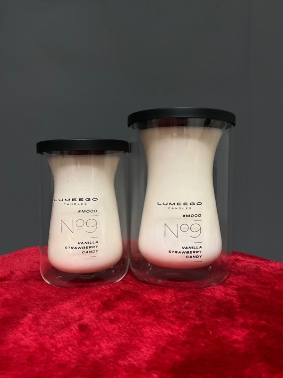 Sojowa świeca zapachowa marki LUMEEGO LUMEEGO Nastrój No9 to wizyta w sklepie z przyjemnymi rzeczami i dobrą muzyką. Zbiera się wanilię i pielęgnuje truskawkowe pola na zawsze.